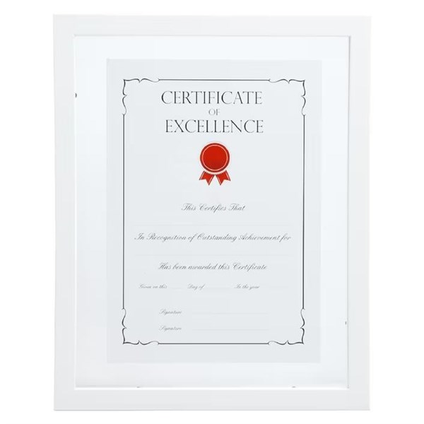 This Floating Certificate Frame is a great way to proudly show off your achievements. The clear Perspex panels will give off the illusion that your certificates are floating. The classically designed white frame will fit in with most pre-existing decor.You can fit any A4 size document into this frame.This frame can be hung both vertically and horizontally.The frame has clips on the backing board so you can easily insert your document.It has an MDF wood construction.This frame is a stylish white design.There is 1 frame in this pack.You can find a solution to hang your new frames and artwork by browsing our range of hooks, strips and wall adhesives.