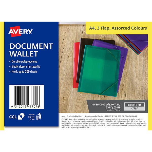 AVERY 47707 DOCUMENT WALLET A4 3 FLAP ELASTIC CLOSURE ASSORTED