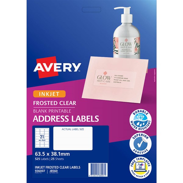 AVERY 936007 J8560 INKJET LABEL 21UP CLEAR WITH MATT FINSH PACK 25