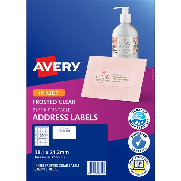 AVERY 936009 J8551 ADDRESS LABEL FROSTED CLEAR INKJET 65UP CLEAR PACK 25
