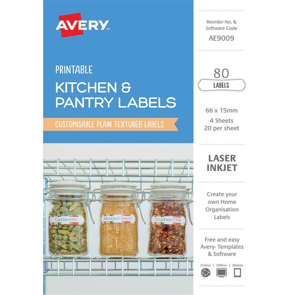 AVERY AE9009 PRINTABLE KITCHEN AND PANTRY LABELS 66 X 15MM TEXTURED WHITE PACK 80