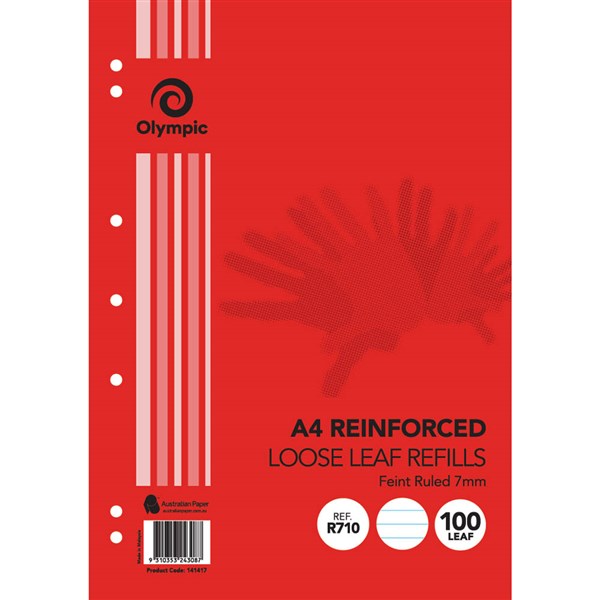 Olympic Loose leaf Refills with various rulings. A4 items are punched 7 holes for use in most binders and folders with reinforcing for extra durability.