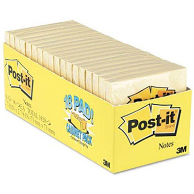 Post-it Notes stick practically anywhere, revolutionary adhesive technology ensures your notes will stick securely to more surfaces. Now you can stick your notes where they will really get noticed...like monitors, doors and walls | 76 mm x 76 mm, canary yellow | Perfect size for leaving notes of encouragement | Trust canary yellow, the most familiar colour, with your important messages | Cabinet packs keep the office supply cabinet neat and organized | 18 pads per cabinet pack | All Post-it notes are recyclable | All Post-it notes are SFI chain of custody certified, paper comes from well-managed forests, where trees are replanted