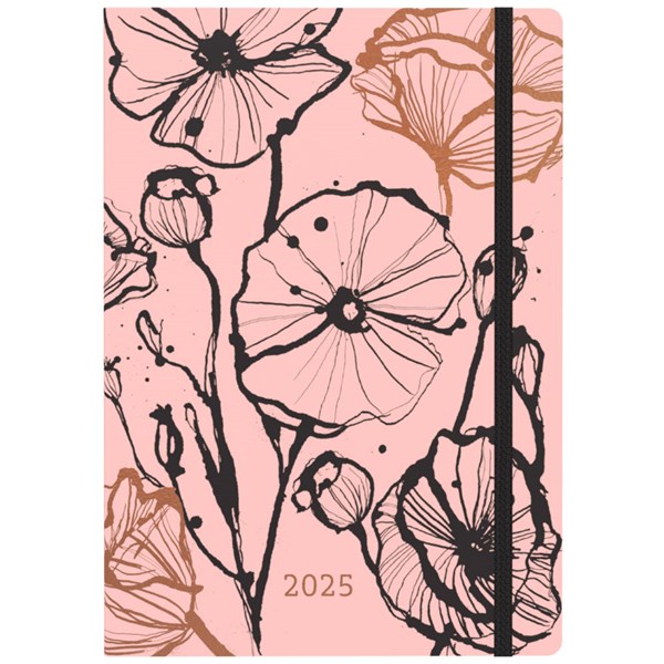 - One design shows botanicals with a textured effect, while the pink diary showcases botanicals loosely hand-drawn using ink and paper