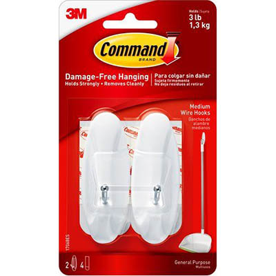 COMMAND ADHESIVE WIRE HOOKS MEDIUM WHITE PACK 2 HOOKS AND 4 STRIPS