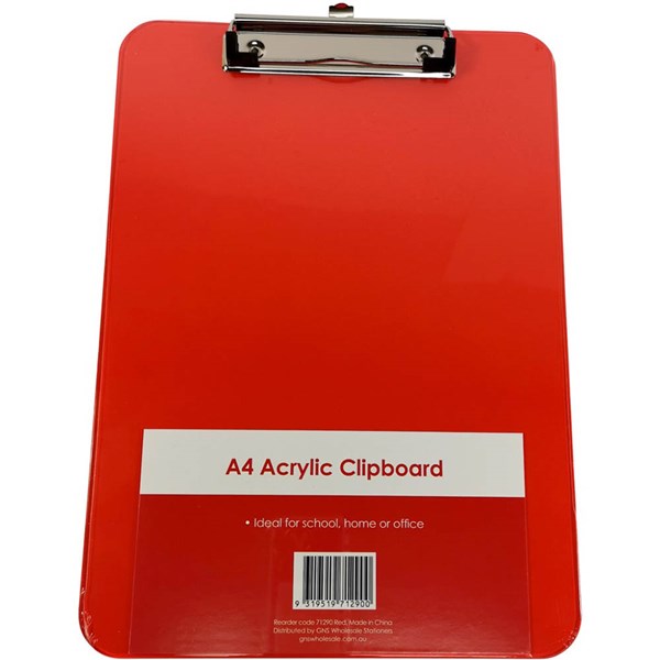 Bright plastic clipboard made from durable acrylic which provides a smooth writing surface