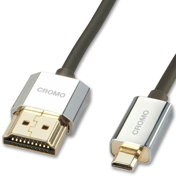 The Lindy CROMO Slim High Speed HDMI to Micro HDMI Cable with Ethernet is an affordable, high quality cable featuring gold plated contacts for better conductivity and resistance to corrosion and tarnishing