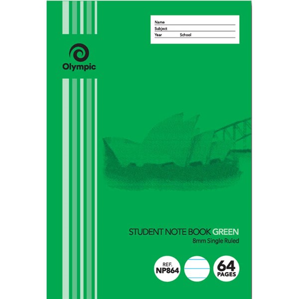 OLYMPIC NP864 EXERCISE BOOK NSW 8MM RULING 55GSM 64 PAGE 250 X 175MM GREEN