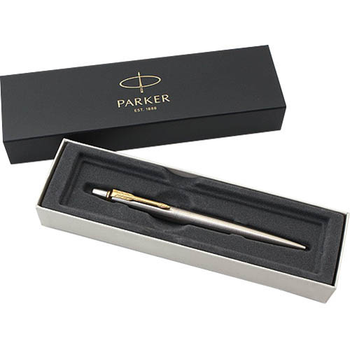 PARKER JOTTER BALLPOINT PEN MEDIUM BLUE INK STAINLESS STEEL GOLD TRIM GIFT BOX