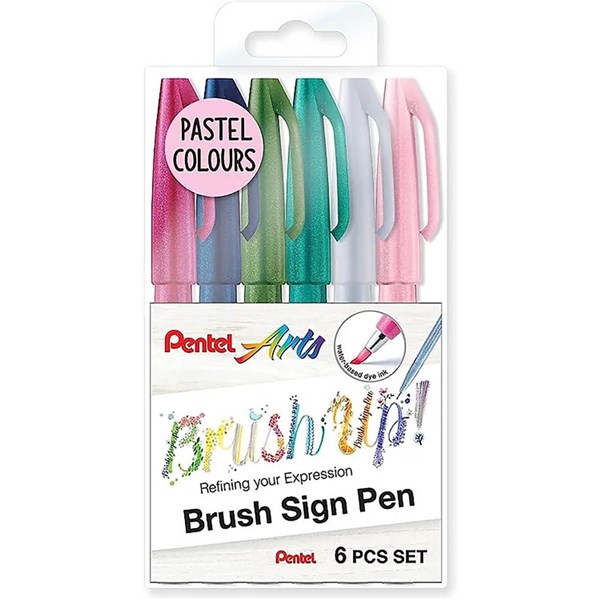 PENTEL ARTS BRUSH SIGN PEN PASTEL ASSORTED COLOUR PACK 6