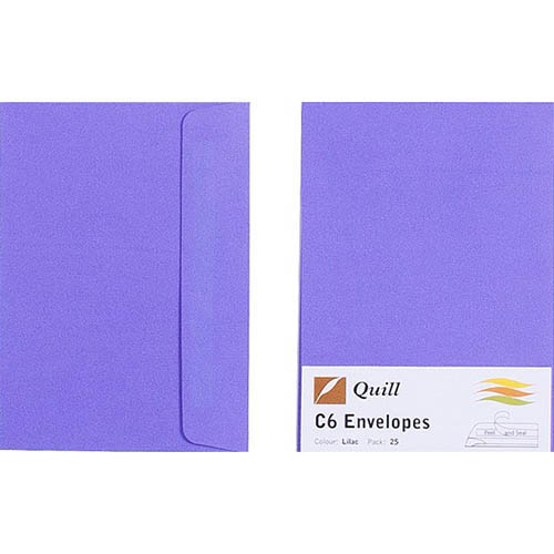 QUILL C6 COLOURED ENVELOPES PLAINFACE STRIP SEAL 80GSM 114 X 162MM LILAC PACK 25