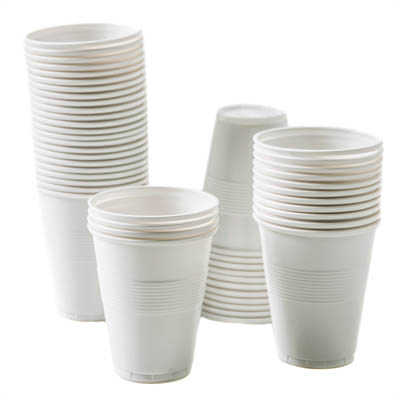 Disposable white plastic drinking cups for the Refresh water cooler dispenser