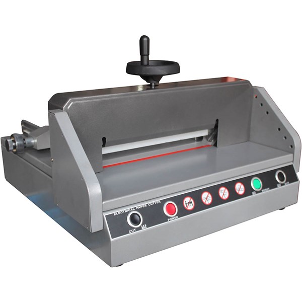 - 2 hand push button electric guillotine, wind down clamp with incline blade cutting technology makes cutting any paper substrate smooth and easy