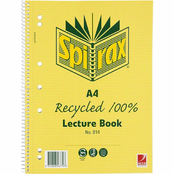 SPIRAX 814 LECTURE BOOK 7MM RULED 7 HOLE PUNCHED 100% RECYCLED SPIRAL BOUND A4 140 PAGE
