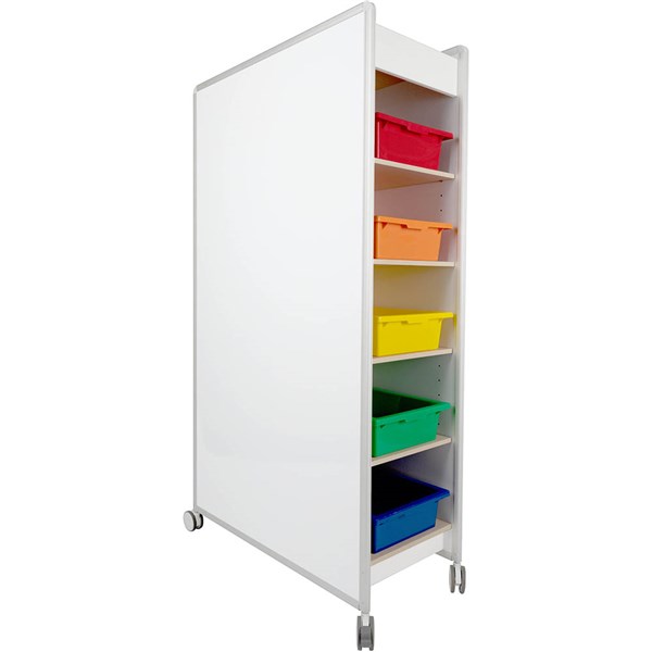 - Easily movable double sided magnetic whiteboard with storage that is split into two making it perfect for shared and adaptable learning environments. Each end has two adjustable shelves giving 8 compartments in total for storage
