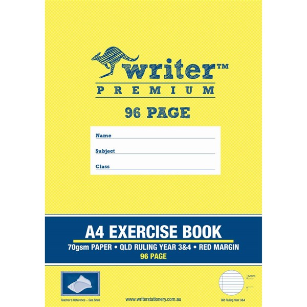 WRITER PREMIUM EXERCISE BOOK QLD RULING YEAR 3/4 70GSM 96 PAGE A4 SEA SHELL