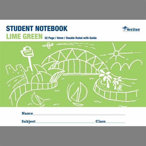 WRITER STUDENT NOTEBOOK 8MM DOUBLE RULED/GUIDE 32 PAGE 250 X 175MM LIME